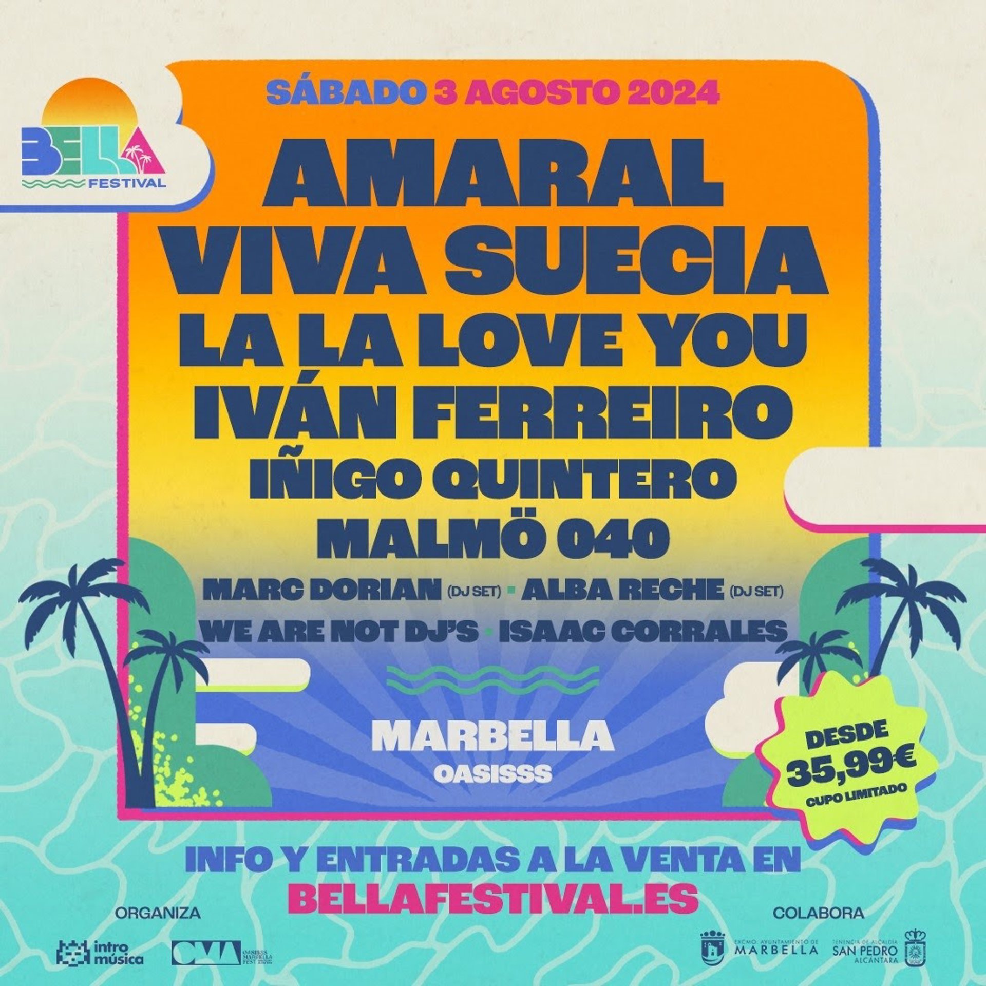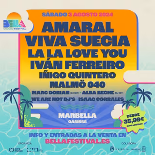 La segunda edición del Bella Festival se celebra el próximo 3 de agosto en el recinto Oasis Marbella Fest con Amaral, Viva Suecia, La La Love You e Iván Ferreiro como cabezas de cartel.