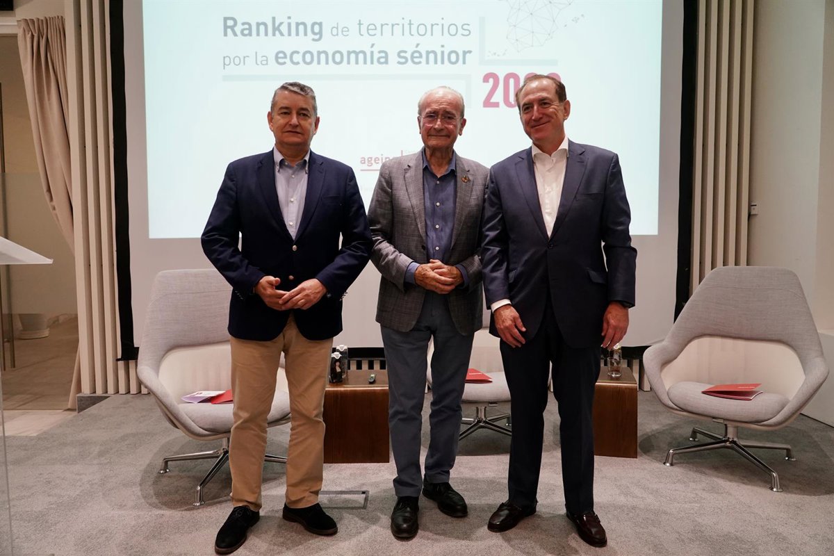 El consejero de la Presidencia, Antonio Sanz (i), el alcalde de Málaga, Francisco de la Torre (c) y el presidente de Mapfre, Antonio Huertas en la presentación del II Ránking de Territorios por la Economía Senior. - Álex Zea - Europa Press