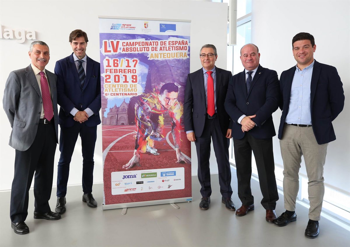 Los presidentes de la Diputación de Málaga, Francisco Salado; de la Real Federación Española de Atletismo (RFEA), Raúl Chapado; de la Federación Andaluza de Atletismo, Enrique López; y el alcalde de Antequera, Manuel Barón, han presentado este campeonato, que se desarrollará en el Centro de Atletismo 6 Centenario de Antequera.