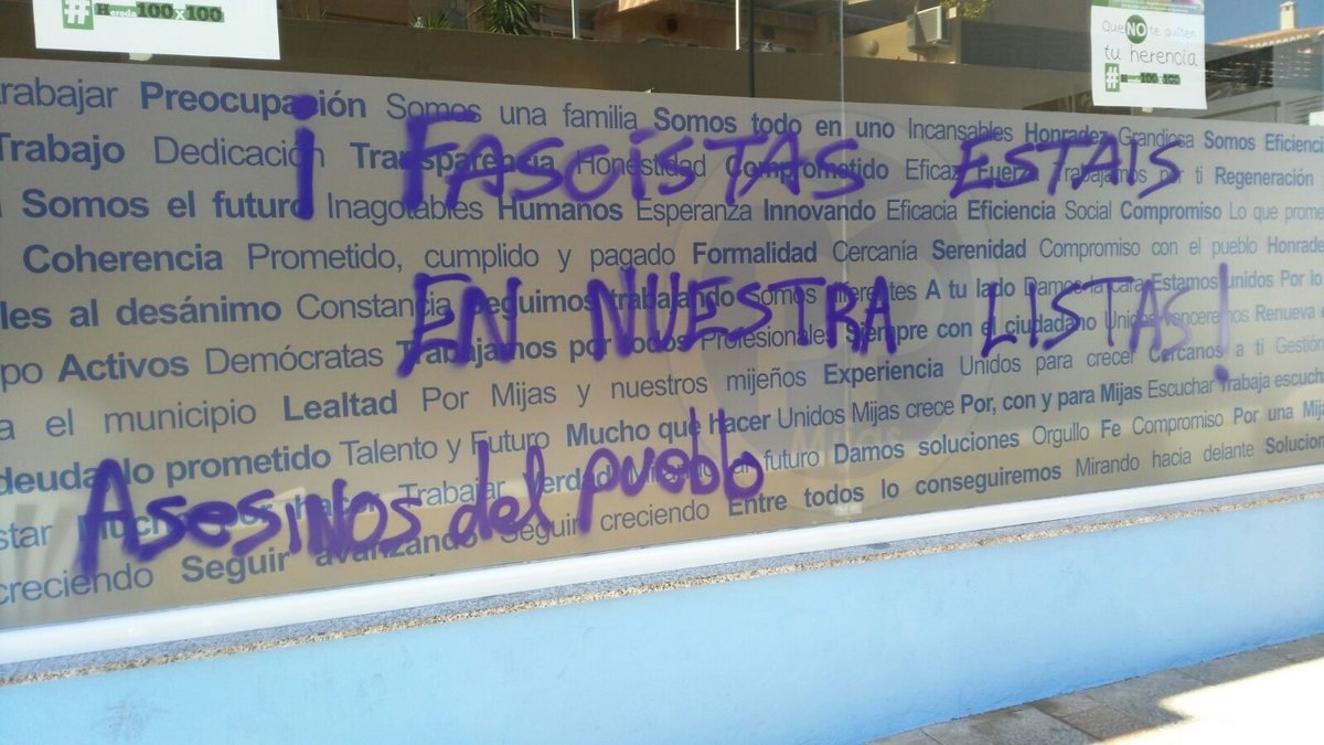 La fachada de la sede del Partido Popular de la localidad malagueña de Mijas ha aparecido este lunes con una serie de pintadas amenazantes, un suceso que ha sido puesto en conocimiento de la Guardia Civil "a fin de que pueda iniciar una investigación, dar con los autores y ponerlos a disposición de la justicia".