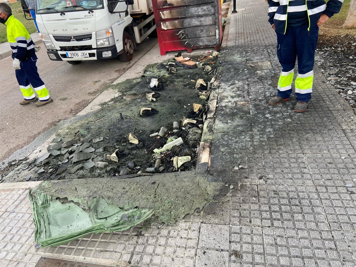 Una vez extinguido el incendio, los Servicios Operativos Municipales procedieron a la limpieza de los restos y su retirada, además de reponer los contenedores quemados a primera hora de este domingo.