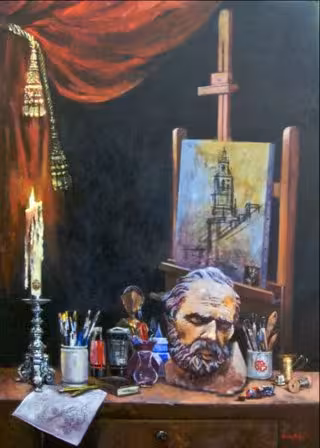 Se trata de una obra experimental realizada en técnica mixta con café, lejía, acuarela y grafito, y que reúne dos emblemas de la ciudad cordobesa unidos en una composición de relevante fuerza plástica y personalidad.