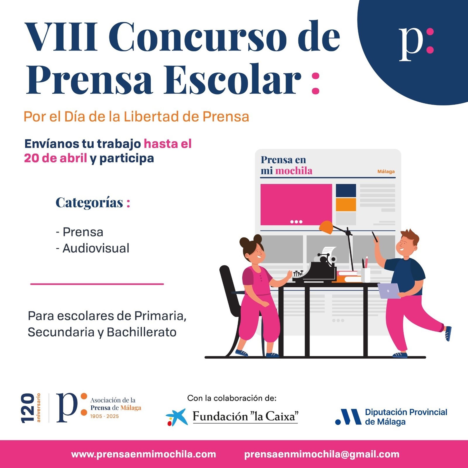 La Asociación de la Prensa de Málaga (APM) y la Diputación de Málaga convocan a la VIII edición del Concurso de Prensa Escolar, con el que invitan a los jóvenes reporteros a redactar sus noticias, entrevistas y reportajes y a presentar sus vídeos y podcast de tono informativo para demostrar su buena redacción o sus dotes periodísticas frente al micrófono o la cámara.