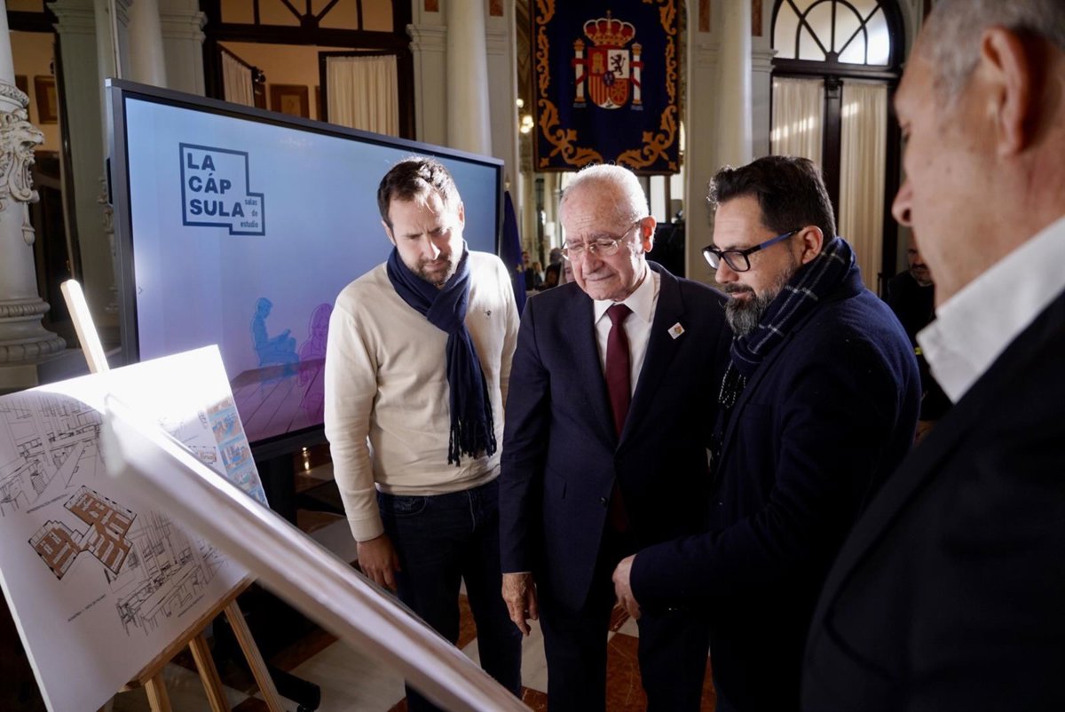 El alcalde de Málaga, Francisco de la Torre, junto a los ediles de Juventud y Vivienda, Luis Verde y Francisco Pomares, respectivamente, ha presentado este martes el proyecto de la cuarta de las 'Cápsulas' de la ciudad, red de salas de estudio que se está impulsando para uso gratuito de estudiantes y opositores.