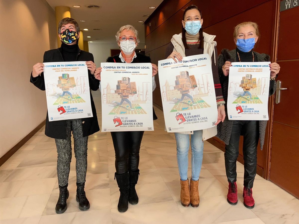 Las concejalas de Comercio, Gestión de la Vía Pública y Fomento de la Actividad Empresarial del Ayuntamiento de Málaga, Elisa Pérez de Siles, y del distrito Cruz del Humilladero, Teresa Porras, y las presidentas de los dos centros comerciales abiertos con los que cuenta la ciudad, Juanibel Vera de Centro Histórico, y Trinidad Núñez de Cruz del Humilladero, han presentado este lunes 'Ahora somos online'.