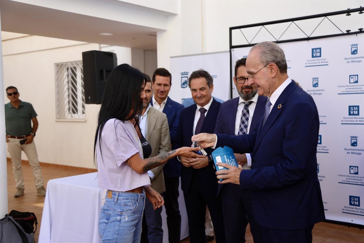 El alcalde de Málaga, Francisco de la Torre, ha hecho entrega este viernes de las llaves de 16 viviendas a familias jóvenes, compuestas por cuatro o más miembros, de la promoción de viviendas que ha promovido y financiado el Ayuntamiento a través de la Sociedad Municipal de Viviendas.