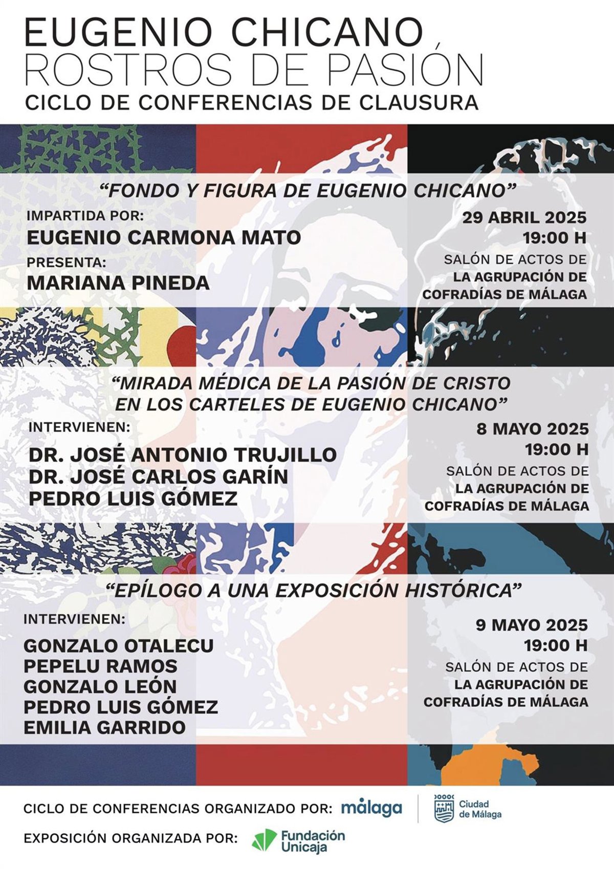 El Ayuntamiento de Málaga, a través del Área de Cultura y Patrimonio Histórico, ha programado un ciclo de conferencias en torno a la figura del artista malagueño Eugenio Chicano con motivo de la clausura de la muestra organizada por la Fundación Unicaja 'Eugenio Chicano. Rostros de Pasión' que actualmente se puede ver en las salas de la Agrupación de Cofradías.