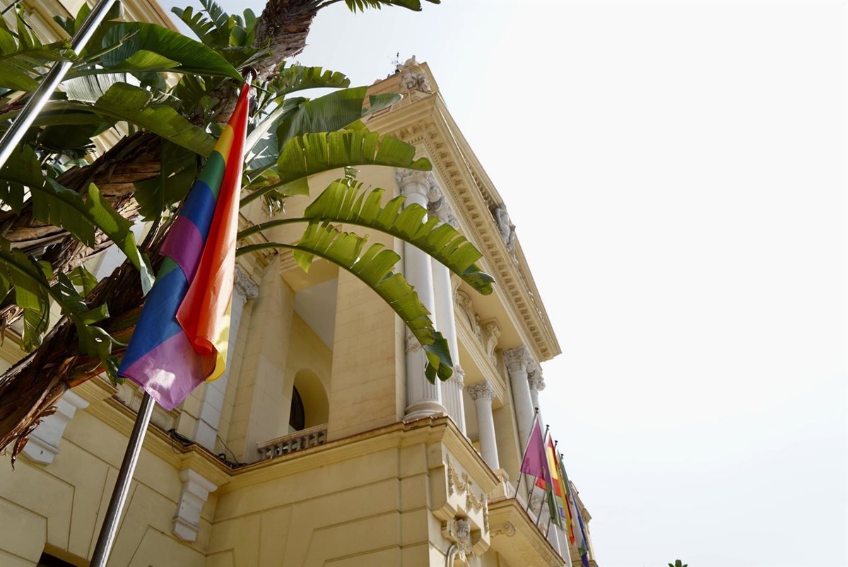 La bandera arcoíris Lgtbi ondea desde primera hora de este miércoles, Día del Orgullo Lgtbi, en la puerta del Ayuntamiento de Málaga capital, donde permanece izada.