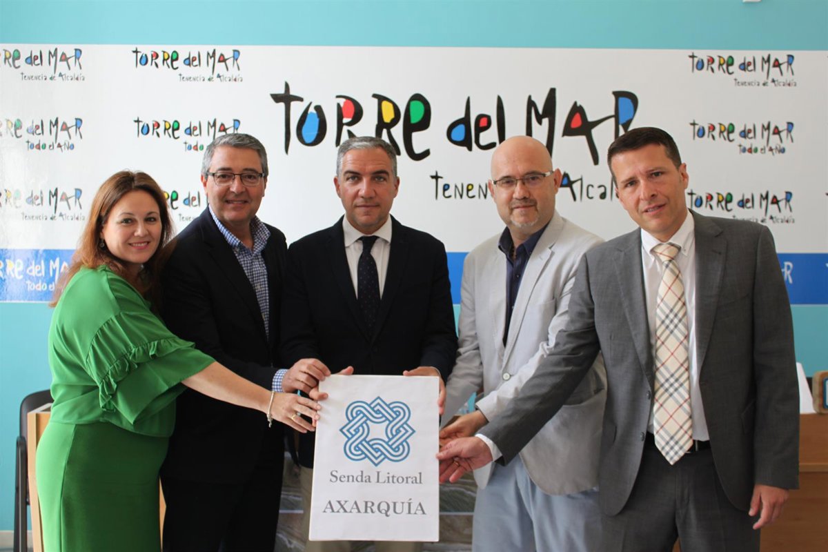 Bendodo ha presentado la situación actual de la Senda Litoral en la costa oriental junto a la diputada de Medio Ambiente y Promoción del Territorio, Marina Bravo; el teniente de alcalde de Torre del Mar y concejal de Playas de Vélez-Málaga, Jesús Pérez Atencia; los alcaldes de Rincón de la Victoria y de Torrox, Francisco Salado y Óscar Medina, respectivamente; y la vicepresidenta de la Mancomunidad de Municipios de la Costa del Sol Axarquía, Natacha Rivas.