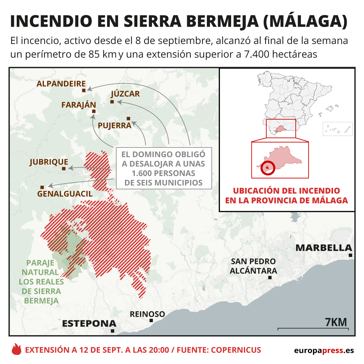 Respecto a las personas desalojadas, ha señalado que este pasado domingo llegó a haber hasta 2.670, pero más de un millar pudieron volver a sus casas de los términos municipales de Estepona y Benahavís, aunque siguen desalojados seis municipios, que suman una población total de unos 1.600 habitantes.