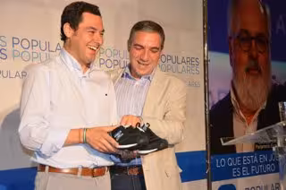 "Se nota que tengo que romper muchos zapatos, abrazar a mucha gente y llevar un mensaje de ilusión de que podemos conquistar un futuro mejor para todos", ha dicho a continuación el presidente del PP-A, que no ha podido ponérselas en ese momento por ser las dos zapatillas del pie derecho.
