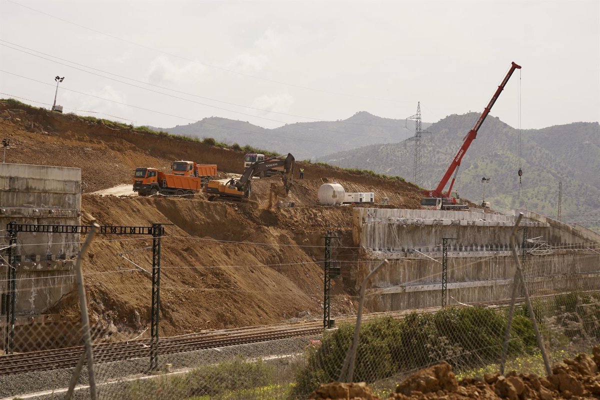 Imagen de las obras de emergencias sobre el talud que se vio gravemente afectado por el pasado temporal a su paso por Álora (Málaga) y que mantiene sin servicio directo la conexión del AVE Madrid-Málaga a las puertas de Semana Santa. - Álex Zea - Europa Press