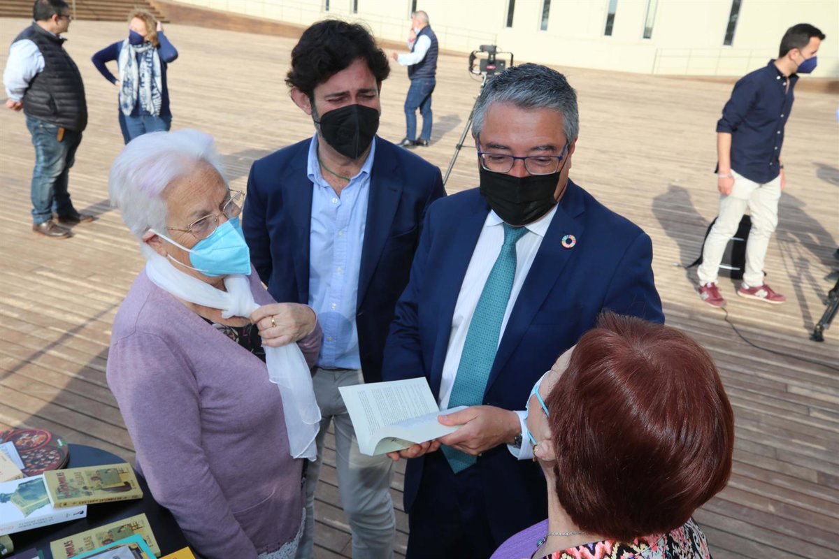 El presidente de la Diputación, Francisco Salado, junto al diputado provincial de Mayores, Francisco José Martín, junto a dos mujeres durante la presentación de la biblioteca itinerante por la provincia de Málaga - DIPUTACIÓN DE MÁLAGA