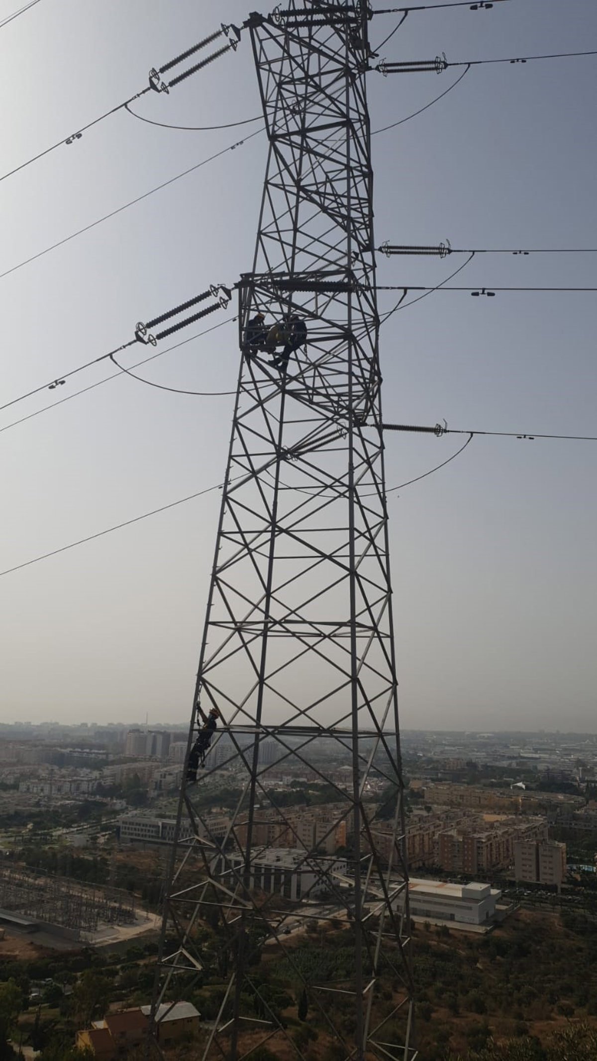 Efectivos del Real Cuerpo de Bomberos de Málaga han rescatado este lunes a una persona que estaba subida a una torreta de alta tensión.