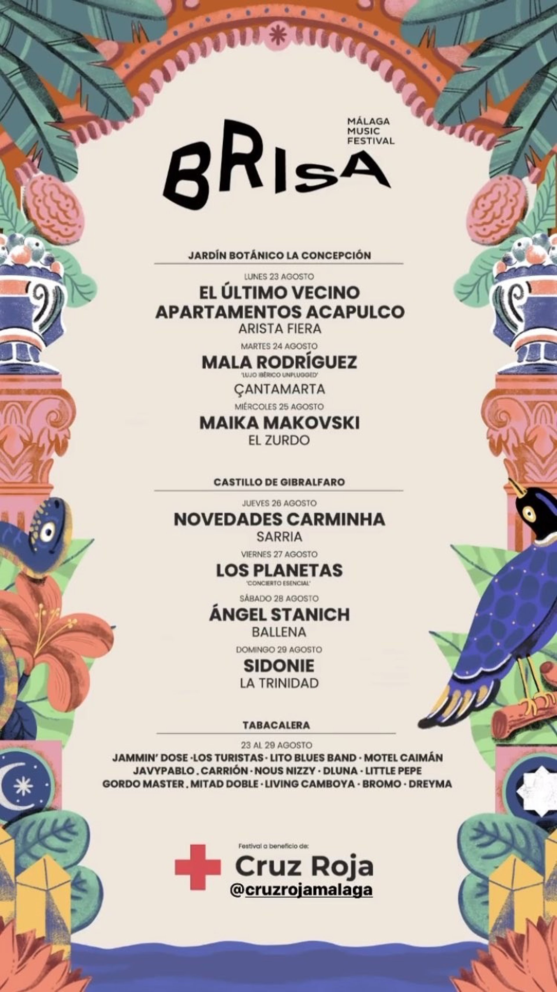 Tres serán los escenarios de la ciudad que acojan los conciertos del 23 al 29 de agosto: el Jardín Botánico de la Concepción, el Castillo de Gibralfaro y Tabacalera. Los beneficios de la venta de entradas irán destinados íntegramente a Cruz Roja.