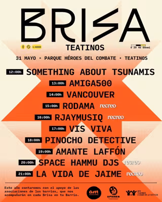 A partir del mediodía, el espacio ubicado junto al Parque del Cine (calle Orson Welles, 1) acogerá en un ambiente festivo las actuaciones de Something about Tsunamis, Amiga 500, Vancouver, Vis Viva, Pinocho Detective y Amante Laffón, todas ellas bandas seleccionadas este año para 'Brisa en tu Barrio'.