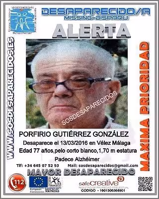 El hombre, que responde al nombre de Porfirio Gutiérrez González, padece alzéhimer, tiene el pelo corto y blanco, 77 años y mide 1,70 metros de estatura.