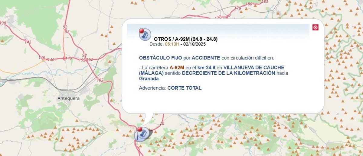 La DGT ha señalado que desde las 6.30 horas una grúa se encuentra en el lugar para completar la tarea de la retirada del camión; y ha señalado que, como ruta alternativa, los vehículos que se dirijan desde Málaga a Granada a la altura del alto de Las Pedrizas tomen la A-45 en dirección Antequera para posteriormente incorporarse más adelante a la A-92M una vez superado el obstáculo.