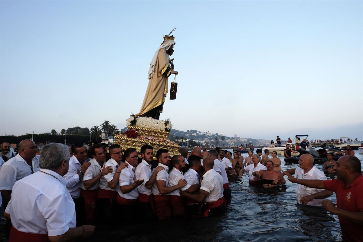 Procesión de la Virgen del Carmen, patrona de los marineros, por las playas del barrio malagueño de El Palo. La Virgen es portada por los marineros. Año 2019. - Álex Zea - Europa Press - Archivo