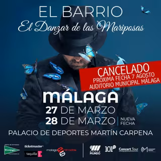El concierto de El Barrio de los días 27 y 28 de marzo en el Palacio de Deportes Martín Carpena de Málaga ha quedado cancelado debido a la medidas de prevención y recomendaciones de las administraciones públicas de evitar espectáculos públicos multitudinarios ante la propagación del virus Covid-19.