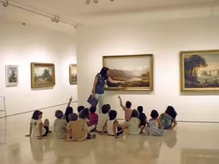 Las obras presentes en esta actividad son 'Nubes de septiembre, 1891', de Childe Hassam, o 'El arco iris, otoño, Catskills' de Worthington Whittredge. Además, los niños conocerán a partir de esta actividad el 'Patio Interior, Sevilla, 1920' de García Rodríguez, que pertenece a la Colección Permanente.