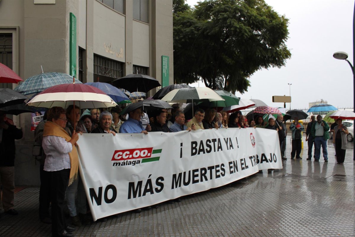 Cerca de un centenar de personas han acudido este lunes a la concentración convocada por los sindicatos CCOO y UGT Málaga, ante la puerta de la Delegación Provincial de Empleo de la Junta de Andalucía, en protesta por el accidente laboral ocurrido este pasado jueves en la localidad malagueña de Teba en el que murió el conductor de un tractor.