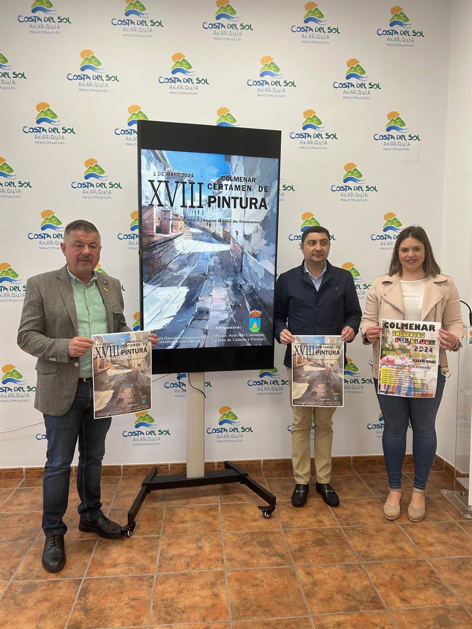 El presidente de la Mancomunidad de Municipios de la Costa del Sol Axarquía, Jorge Martín; el alcalde de Colmenar (Málaga), José Martín y la concejala de Cultura y Fiestas, María José Juárez; han presentado este martes la 18 edición del Certamen de Pintura de Colmenar, que tendrá lugar el miércoles 1 de mayo.