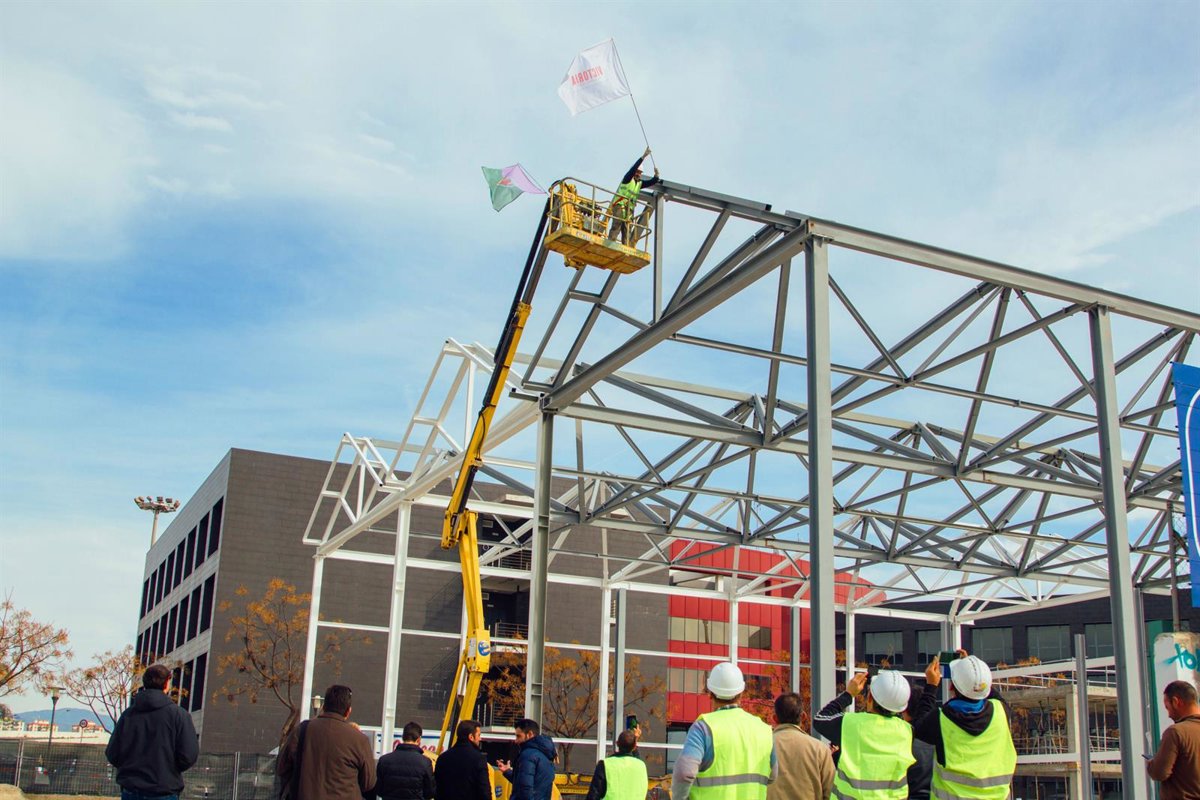 La nueva fábrica de Cerveza Victoria en Málaga ya tiene en pie su armazón. El cierre de esta fase de la obra se ha celebrado con el tradicional acto de colocación de la bandera. Además, tras la puesta de la enseña, se ha organizado un almuerzo al que han asistido tanto el personal de obra como los arquitectos del proyecto, que corre a cargo del estudio de arquitectura malagueño GANA.