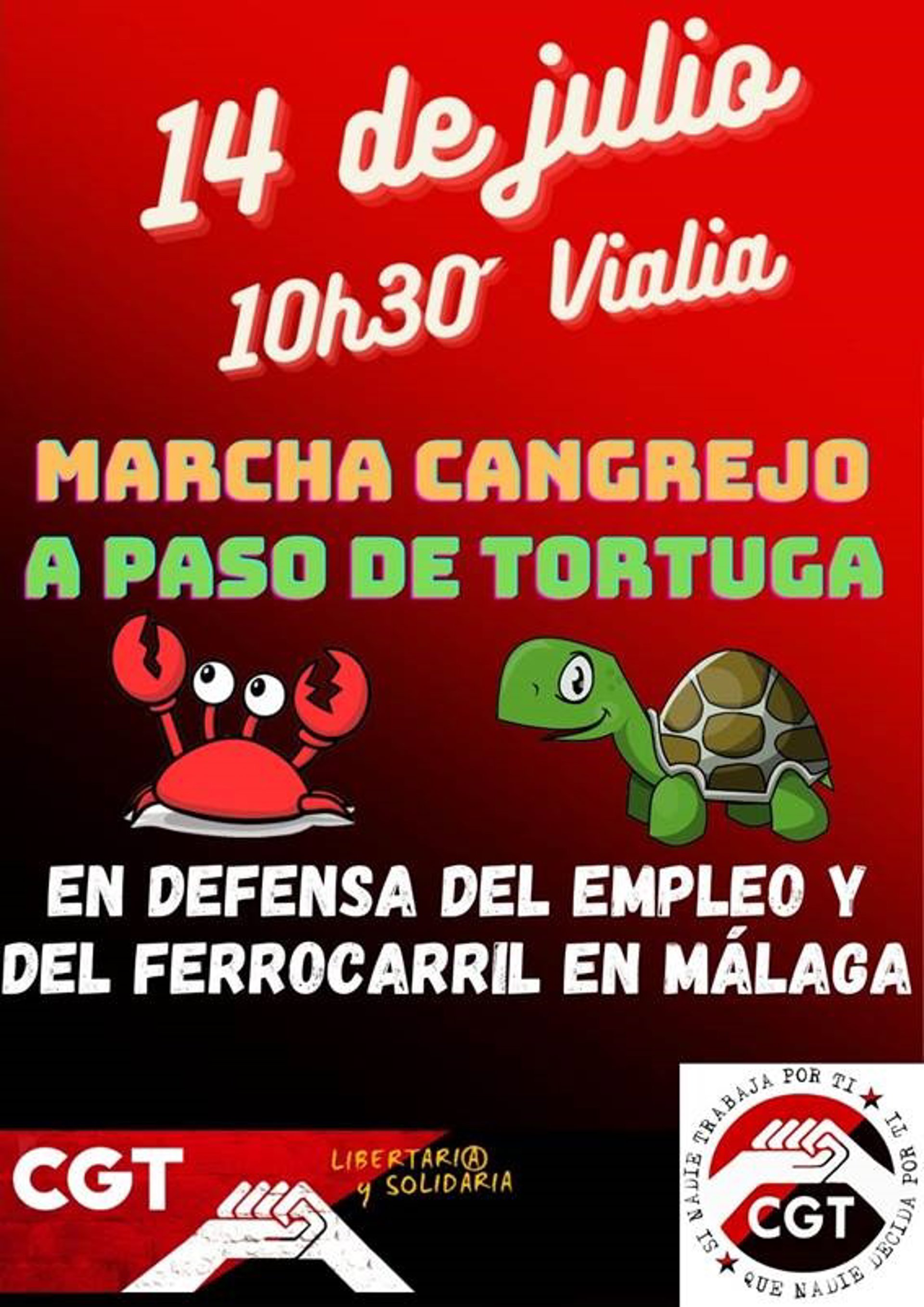El próximo viernes 14 de julio, como colofón a una nueva semana en la que se reclaman fundamentalmente puestos de trabajo en el sector ferroviario, CGT ha convocado en Málaga una 'Marcha cangrejo a paso de tortuga' que se desarrollará en el entorno de la estación de la capital malagueña.