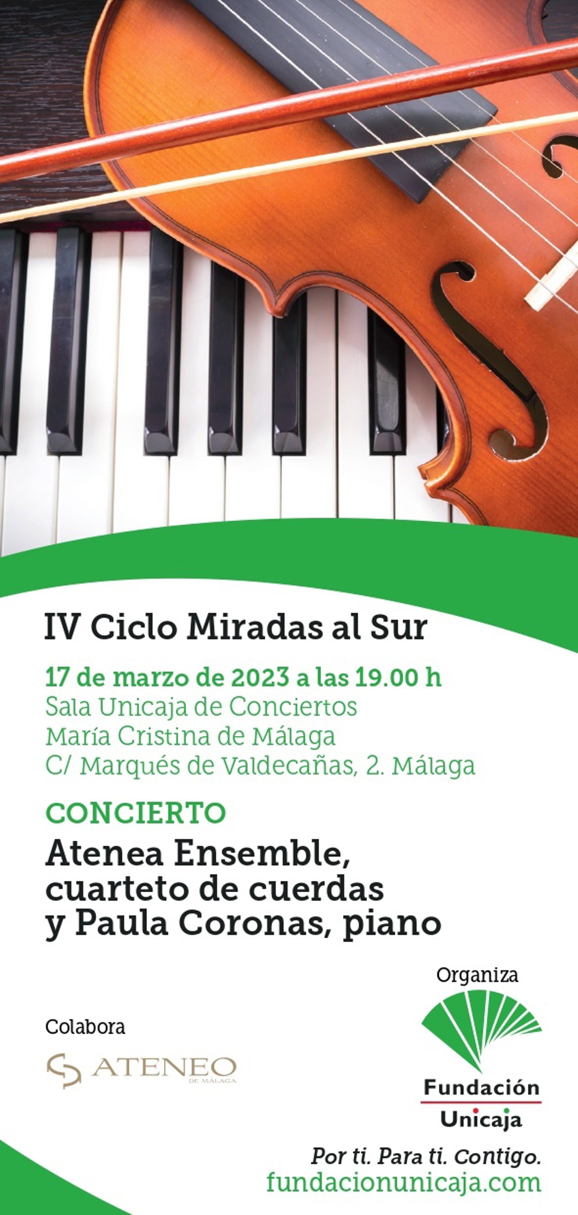 La Sala Unicaja de Conciertos María Cristina acoge una nueva cita musical del ciclo 'Miradas al Sur' de la Fundación Unicaja con el concierto de Paula Coronas y el cuarteto de cuerda Atenea Ensemble el próximo viernes 17 de marzo a las 19.00 horas con entrada libre hasta completar aforo.