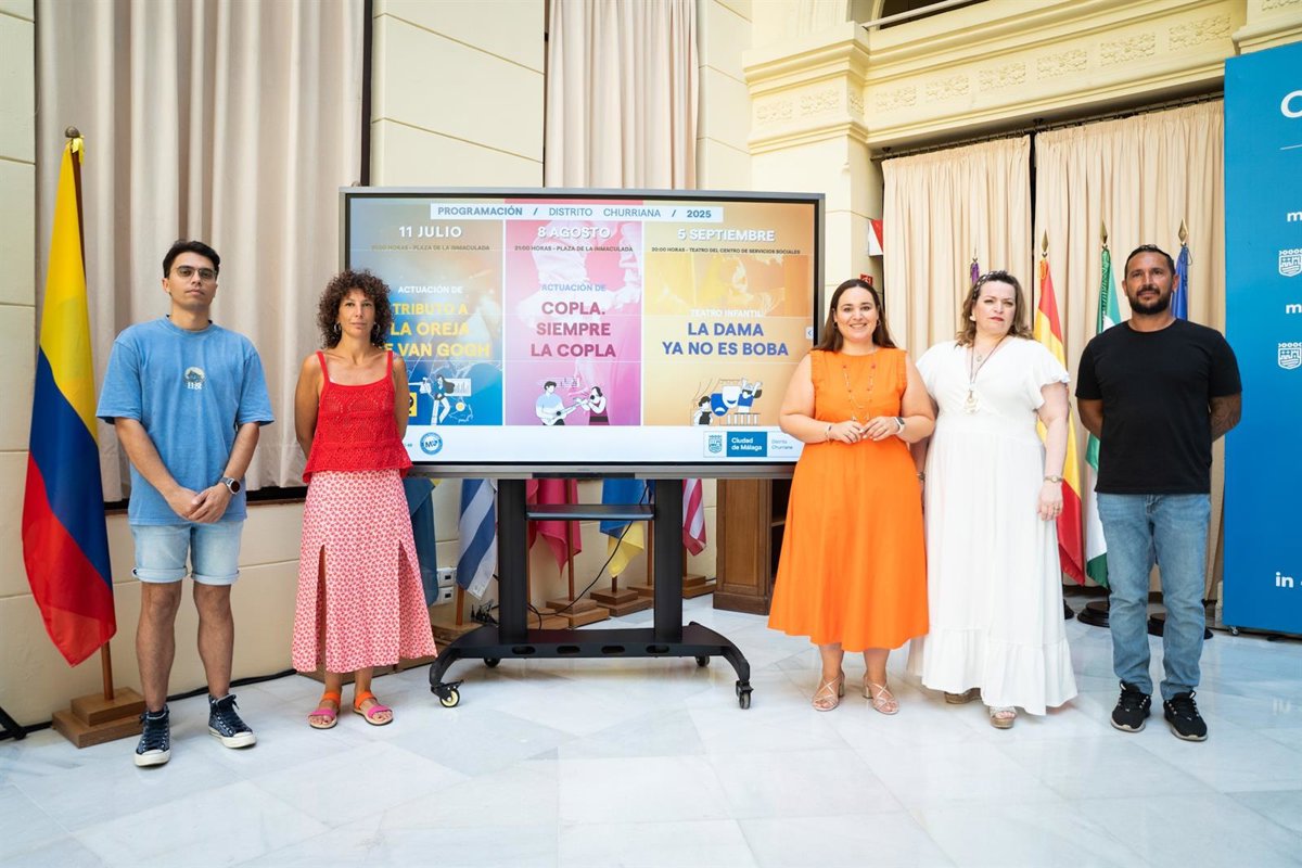 La concejala delegada del distrito de Churriana, Mercedes Martín, junto a los representantes de colectivos y asociaciones que participan en el programa ha presentado las actividades. El ciclo comienza el viernes, 11 de julio a las 21.00 horas con el concierto Tributo a la Oreja de Van Gogh en la plaza de la Inmaculada.