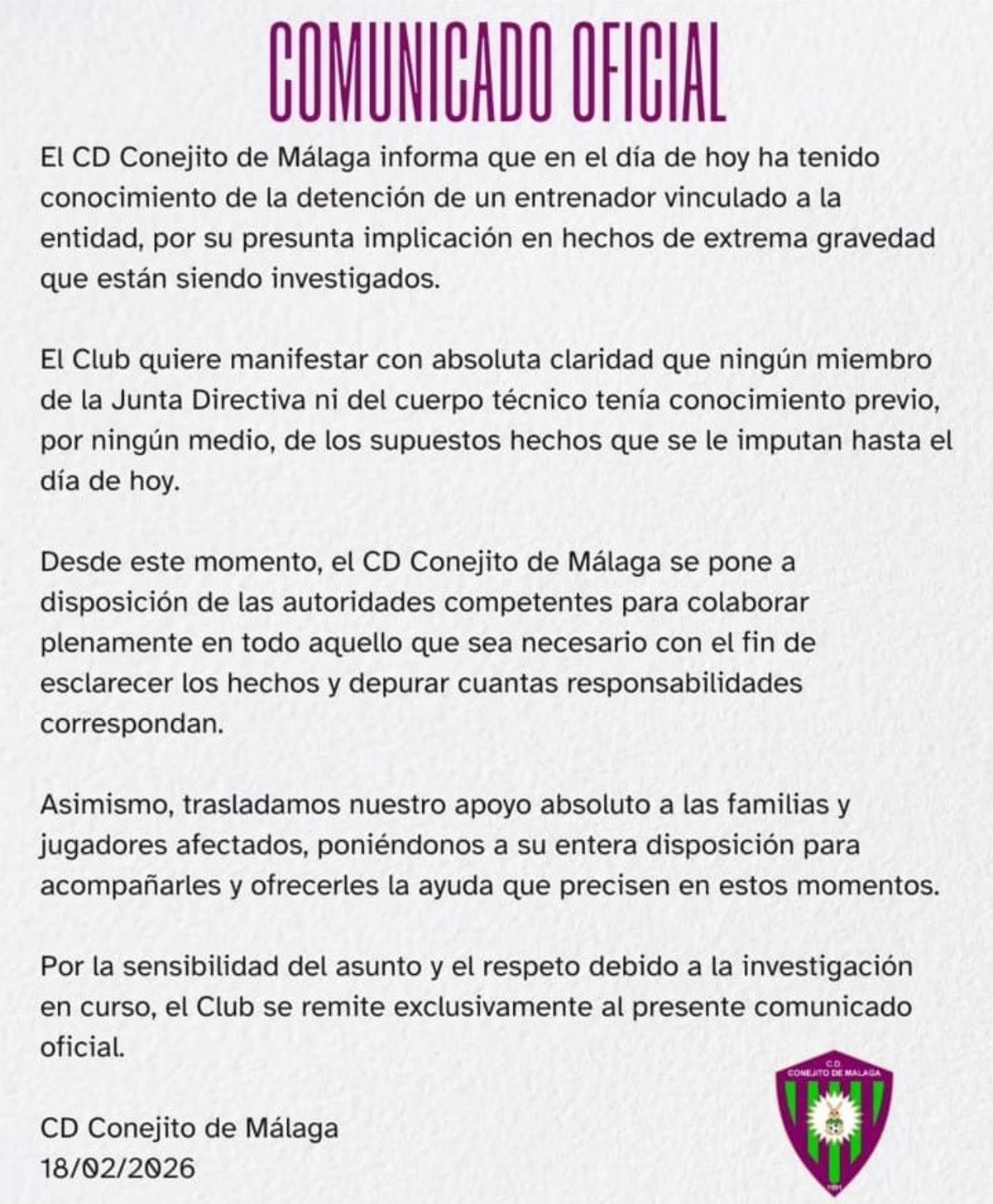 El CD Conejito de Málaga expresa su respeto a la investigación en curso y también muestra su apoyo a las familias y jugadores afectados, poniéndose a disposición de los mismos para acompañarles y ofrecerles la ayuda que precisen.