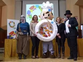 La figura de un cocinero mostrando un gran plato blanco sobre el que posan productos de la provincia se ha convertido en la mascota de la marca promocional Sabor a Málaga en un proceso de elección en el que han participado medio millar de escolares de 70 centros educativos de la provincia. Tenían tres propuestas: un guante, un boquerón y el cocinero.