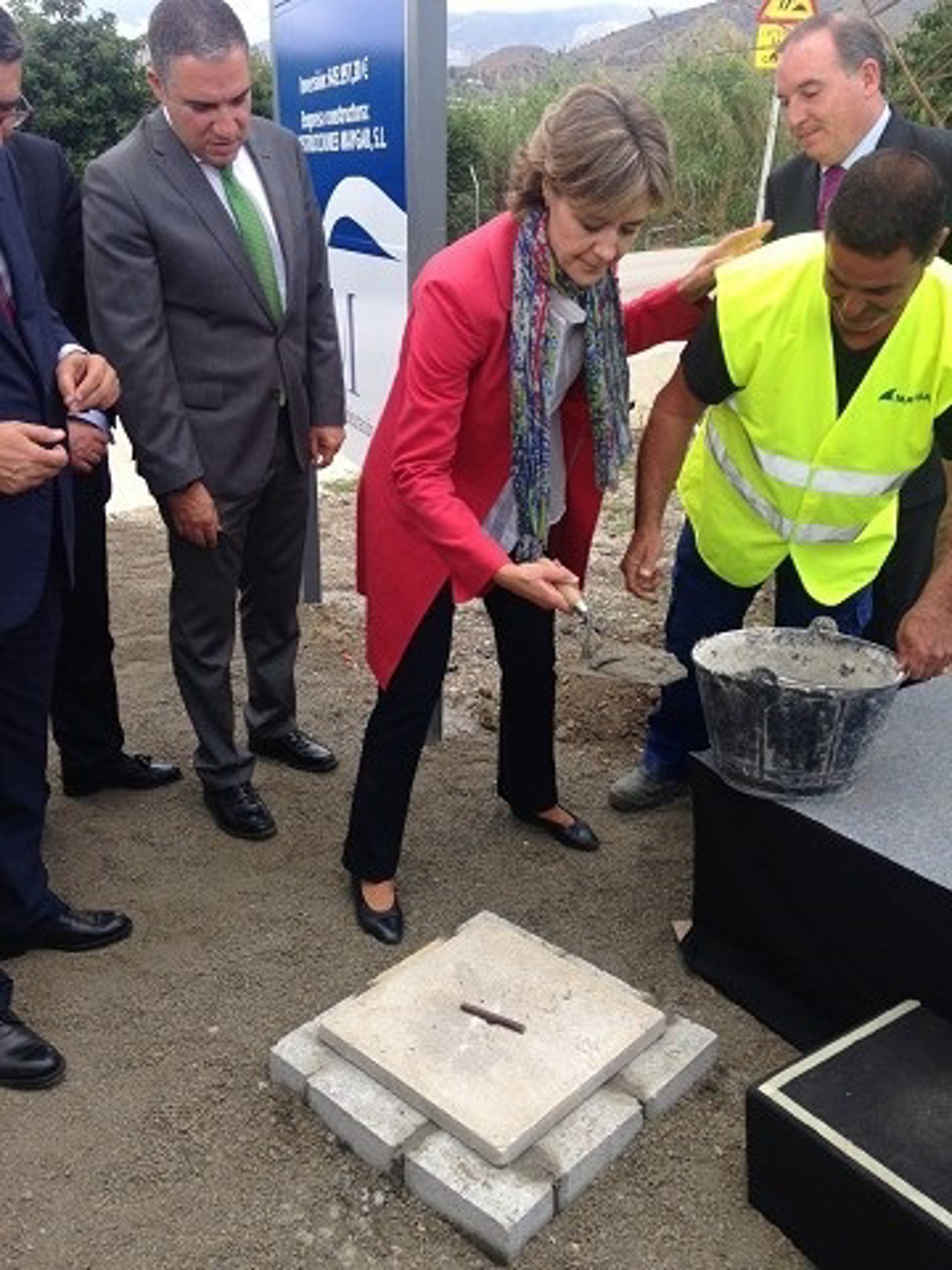 La ministra de Agricultura, Alimentación y Medio Ambiente, Isabel García Tejerina, y el presidente de la Diputación, Elías Bendodo, han presidido este martes el acto de colocación de la primera piedra, en el que también han estado presentes el subdelegado del Gobierno en Málaga, Miguel Briones, el alcalde de Vélez-Málaga, Antonio Moreno, y el diputado de Sostenibilidad, Francisco Delgado Bonilla, entre otros.