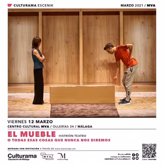 La compañía granadina Histrión Teatro llega el próximo viernes 12 de marzo al MVA con su obra 'El Mueble (o las cosas que nunca nos diremos)' que tendrá lugar a las 19.00 horas y para la que se podrán adquirir las entradas desde el lunes 8 de marzo en la plataforma mientrada.net a partir de las 10.00 horas. Asimismo, podrá seguirse en streaming en directo a través del canal de Youtube del MVA.