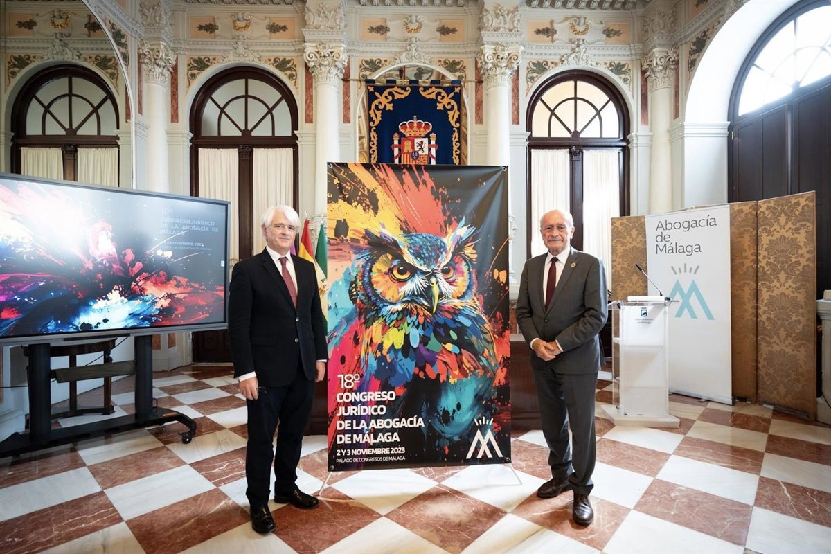 El decano de la Abogacía de Málaga, Salvador González, y el alcalde de Málaga capital, Francisco de la Torre, han presentado la 18 edición del Congreso Jurídico de la Abogacía, que tendrá lugar los días 2 y 3 de noviembre y que abordará materias como los desafíos de la Inteligencia Artificial o la violencia vicaria; además de incorporar como novedad este año testimonios directos.