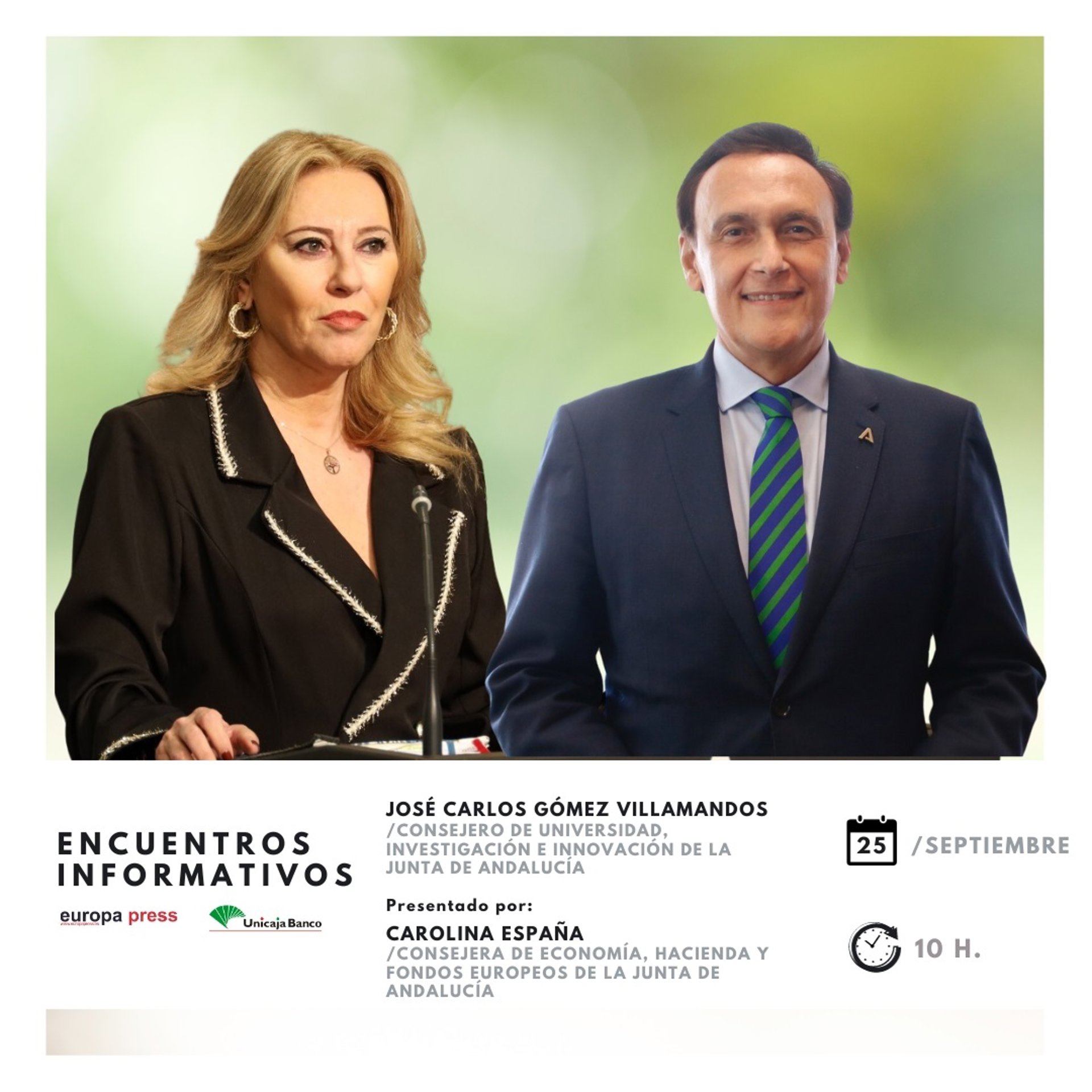 Cartel anunciador del encuentro informativo de Europa Press Andalucía con el consejero de Universidades, José Carlos Gómez Villamandos, el 25 de septiembre en Málaga presentado por la consejera de Economía, Carolina España - EUROPA PRESS