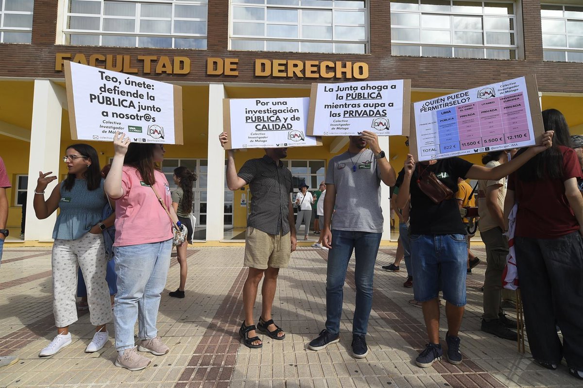 La coordinadora UMA (Universidad de Málaga) x la Pública ha desarrollado este martes una concentración de protesta a las puertas de la Facultad de Derecho mientras en su interior se celebraba la inauguración oficial del curso universitario. Los manifestantes han reivindicado "una financiación digna de la universidad pública", lema bajo el que han protestado.
