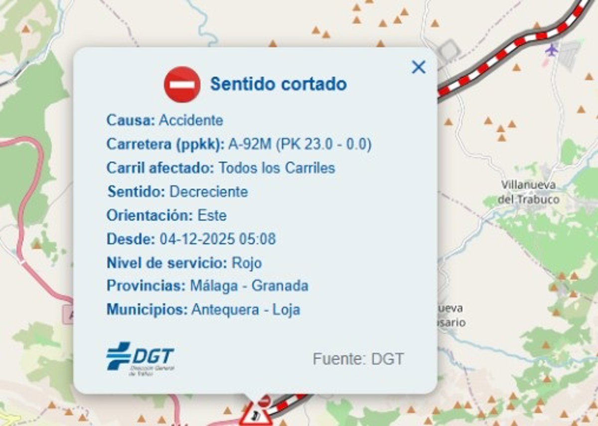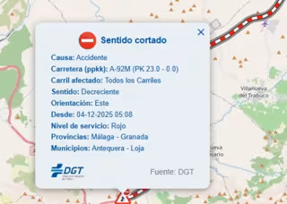 El corte afecta al tramo comprendido entre los kilómetros 0 a 23 de la A-92M y el tráfico se ha desviado a través de la A-45.