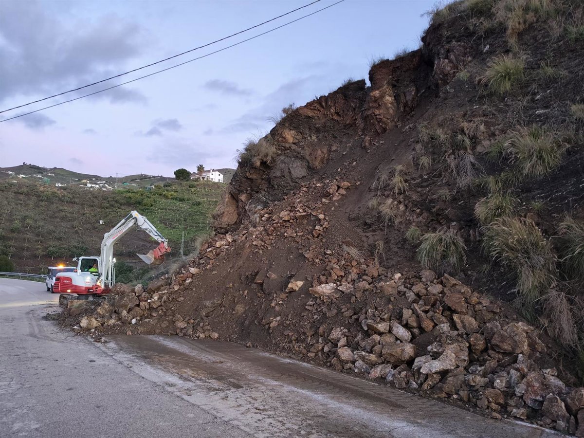 Las consecuencias del paso de las borrascas siguen dejando vías cortadas en la provincia de Málaga. Así, la MA-3112 a su paso por el municipio malagueño de Almáchar permanece cortada tras el deslizamiento de un talud "con una situación de alto riesgo".
