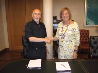 La rectora de la UMA, Adelaida de la Calle, y el máximo representante del Comité Provincial de Cruz Roja Española en Málaga, Antonio Morales, han suscrito este lunes en el Rectorado el convenio específico de colaboración que contribuirá al fomento de las actividades deportivas culturales de la Universidad malagueña.
