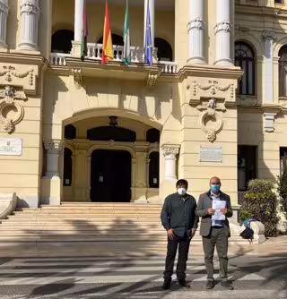 Juan Carlos Pedrosa, presidente de CSIF Málaga, y Francisco González, responsable de Educación del sindicato, tras registrar la petición en el Ayuntamiento de la capital. - CSIF