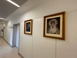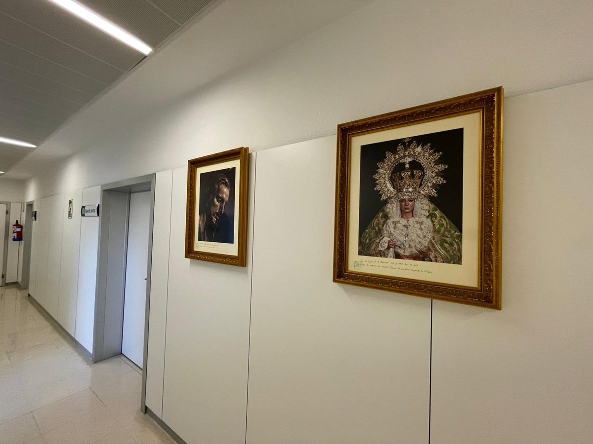 Los cuadros de Jesús Nazareno del Paso y María Santísima de la Esperanza, dedicados al Hospital Clínico de Málaga como obsequio por parte de la Archicofradía del Paso y la Esperanza, se encuentran desde la mañana de este lunes instalados en la galería del pabellón de Gobierno de este centro hospitalario.