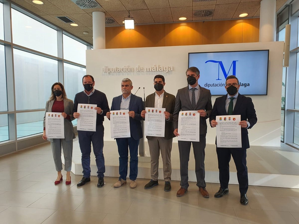 Los alcaldes de Fuente de Piedra, Siro Pachón; Alameda, José García; Humilladero, Miguel Asensio, y Mollina, Eugenio Sevillano, en rueda de prensa junto a los diputados provinciales Teresa Sánchez (UPporM) y Manuel Chicón (PSOE) - EUROPA PRESS