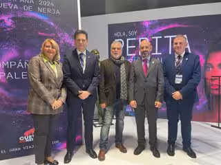 El presidente de la Fundación Pública de Servicios Cueva de Nerja, Javier Salas; el primer teniente alcalde de Nerja, Francisco Arce; la concejala de Turismo, Ana María Muñoz; y el gerente de la Cueva de Nerja, José María Domínguez, y el director Benito Zambrano han presentado este jueves en Fitur la nueva película sonora del cineasta, denominada 'Pepita', con el que supone un nuevo formato de audioguía.