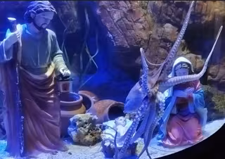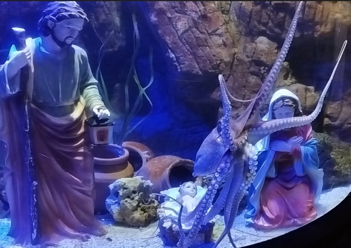Así, Sea Life propone un portal de Belén en la cueva del pulpo, "donde los tentáculos de este cefalópodo se quedan atrapados junto al niño Jesús, la Virgen o San José".