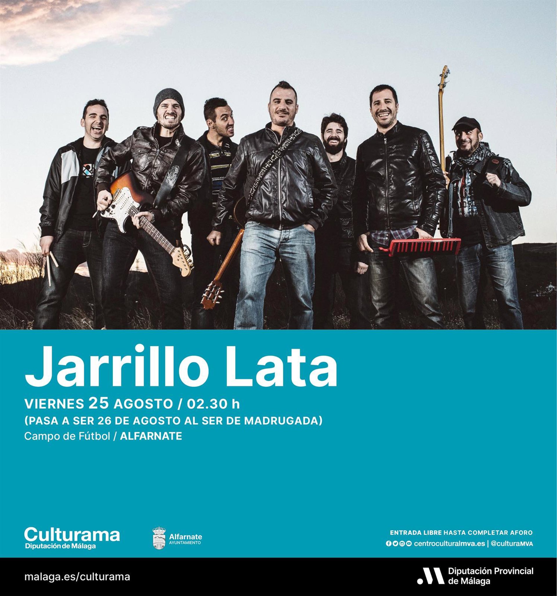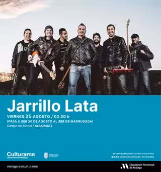 Así, a través de un comunicado de prensa, detallan que Jarrillo Lata actuará la madrugada del 25 de agosto (26 de agosto) a partir de las 2.30 horas en el campo de fútbol de Alfarnate. La banda malagueña será la encargada de amenizar la velada con un sonido ecléctico, 'malaguita' y universal, mezclando estilos como el reggae, ska, rock, flamenco, jazz, rumba y el funk.