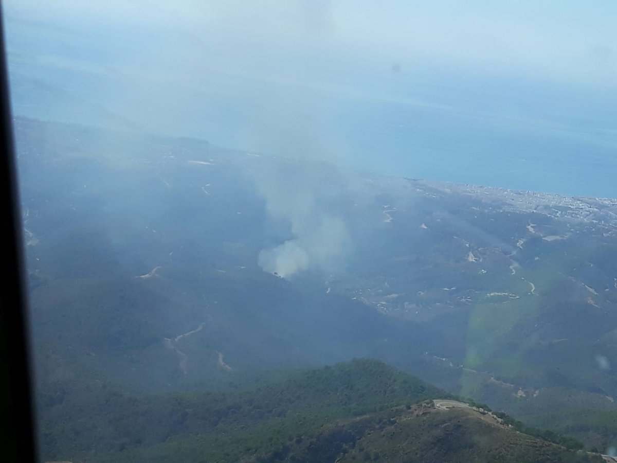 El dispositivo para la prevención y extinción de incendios forestales en Andalucía (Plan Infoca) trabaja para apagar las llamas de un fuego declarado en el paraje Peñas Blancas de Estepona (Málaga).