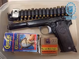 Los policías locales solicitaron a los familiares que les hicieran entrega del arma, comprobando que se trataba de una pistola Astra 400 modelo 1921 de calibre 9mm que guardaba en el interior de un recipiente de plástico junto a un cinturón de cuero con 28 cartuchos y dos cajas de cartón, una con 50 y la otra con otros 25 cartuchos, siendo tanto el arma como la munición intervenidos.