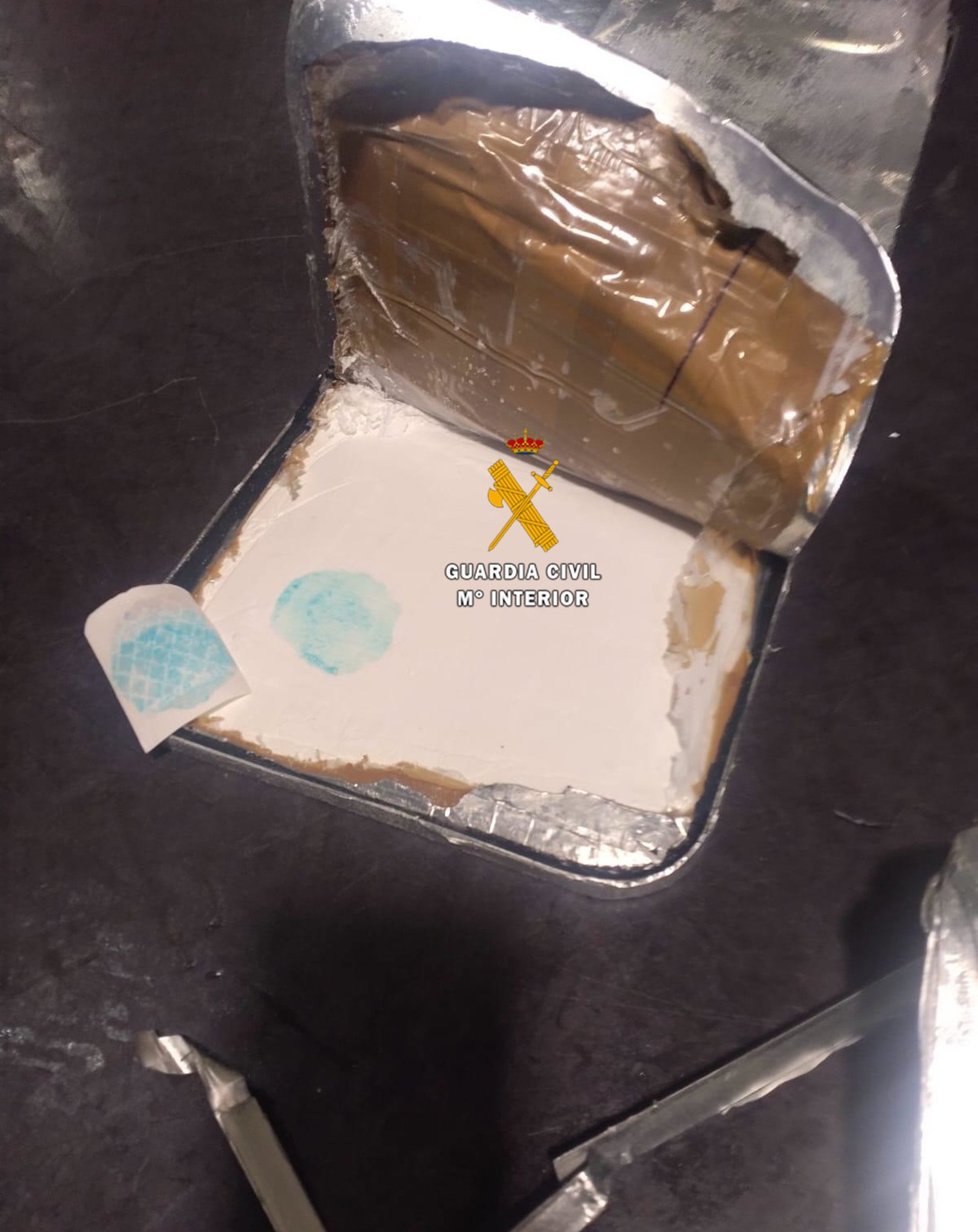 Una vez extraídas las pertenecías personales, los agentes observaron dos planchas laterales forradas y prensadas en forma de paquetes que contenían una materia blanquecina. Tras pasar la citada materia por el análisis de drogatest, resultó positivo en cocaína, por lo que se procedió a la detención.